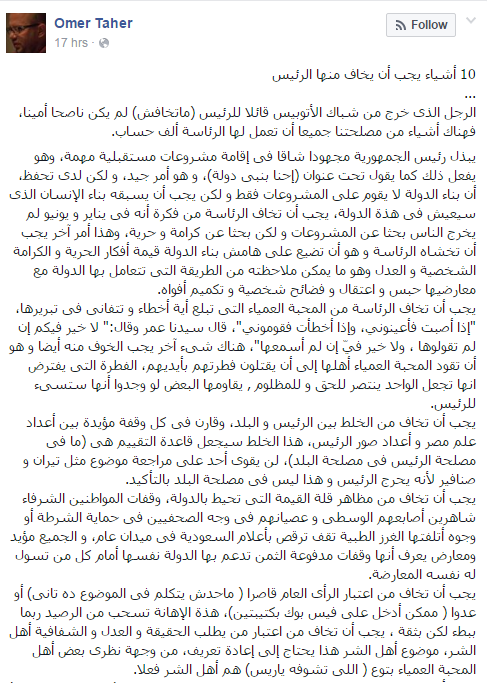 واستطرد “طاهر” في منشوره قائلًا: “يجب أن تخاف الرئاسة من المحبة العمياء التي تبلع أية أخطاء وتتفانى في تبريرها.. “إذا أصبت فأعينوني، وإذا أخطأت فقوموني”، قال سيدنا أبو بكر.. وقال: “لا خير فيكم إن لم تقولوها، ولا خير فيّ إن لم أسمعها”.