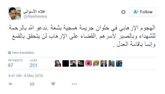 وقال “الأسواني” -عبر حسابه على موقع التواصل الاجتماعي “تويتر”-: “إن الهجوم الإرهابي في حلوان جريمة همجية بشعة”، داعيًا للشهداء بالرحمة والصبر لأسرهم، مضيفًا “القضاء على الإرهاب لن يتحقق بالقمع وإنما بإقامة العدل”.