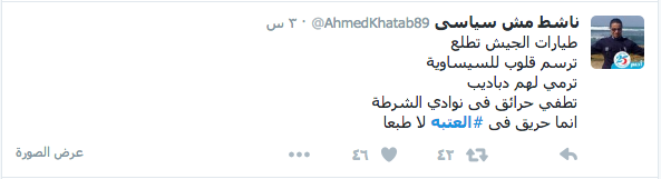 وأضاف في منشور له على موقع التواصل الاجتماعي “فيس بوك”: ماتنسوش انه عمل شوية مسرحيات بعد الفض منها برده حريق مبنى المقاولون العرب في رمسيس بس أبو 50% عمل الحريقة فوق في اخر دورين.. يعني طيارة اللي عملته مش المتظاهرين اللي بينهم وبين الحريقة 11 دور.