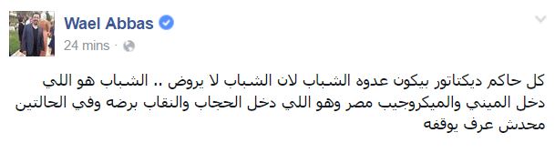 وقال -عبر منشور له على “فيس بوك”-: “كل حاكم ديكتاتور بيكون عدوه الشباب لأن الشباب لا يروض.. الشباب هو اللي دخل الميني والميكروجيب مصر وهو اللي دخل الحجاب والنقاب برضه وفي الحالتين محدش عرف يوقفه”.