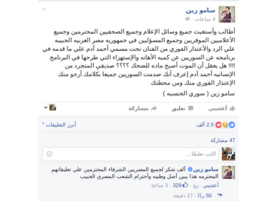 وقال سامو زين، عبر صفحته الرسمية بموقع التواصل الاجتماعي “فيس بوك”: “أطالب وأستغيث بجميع وسائل الإعلام وجميع الصحفيين المحترمين وجميع الإعلاميين الموقرين وجميع المسؤولين في جمهورية مصر العربية الحبيبة على الرد والاعتذار الفوري من الفنان تحت مسمى أحمد آدم على ما قدمه في برنامجه عن السوريين عن كمية الإهانة والاستهزاء التي طرحها في البرنامج”.