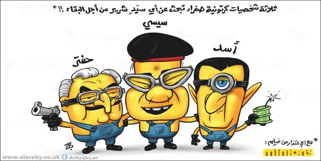 ونشر موقع “العربي الجديد” رسمًا ساخرًا يجمع الأسد والسيسي وحفتر وهم مجتمعون بحثًا عن بقية “أهل الشر”.