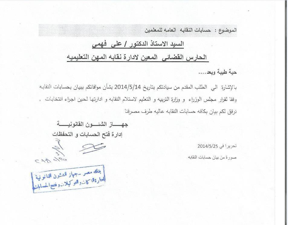 ذكرت مستندات، أن قيمة المبالغ التي قدرت بحساب نقابة المعلمين منذ أن تسلمها الحارس القضائي في مايو 2014 بلغت 3.8 مليار جنيه، وفقًا لما أكده الدكتور علي فهمي، الحارس القضائي المعين لإدارة نقابة المهن التعليمية، في خطاب للموافاة بحساب نقابة المهن التعليمية.