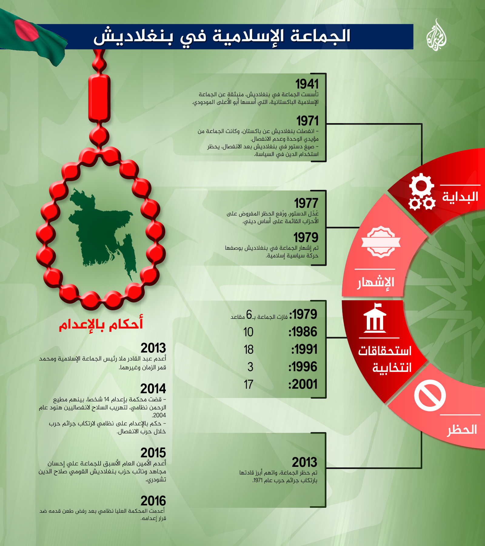 8-  2013 تم حظر الجماعة واتهم أبرز قاداتها بارتكاب جرائم حرب عام 1971، وفي نفس العام تم إعدام عبد القادر ملا رئيس الجماعة الإسلامية، ومحمد قمر الزمان وغيرهما.