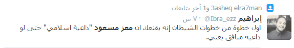 وكان الداعية الشاب معز مسعود دائم الحرص على أن يظهر كواحد ممن يحاولون إمساك منتصف العصا، حينما دعا في برنامج 90 دقيقة على قناة المحور إلى استخدام طريقة “الترغيب” في “خروج آمن للرئيس المخلوع مبارك”، وكأنه يحاول تقديم رؤية للخروج من الأزمة، ورفض بشدة أن يتعامل المصريون كما تعامل التونسيون بطريقة “الترهيب”.