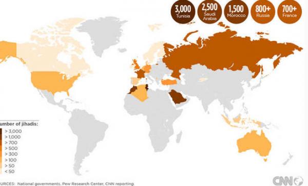 وكشفت أرقام الخريطة المأخوذة من الإحصاءات الرسمية للدول بحسب مركز “بوي” للأبحاث، أن أكثر الدول التي خرج منها مقاتلون إلى سوريا هي تونس، حيث وصل عددهم إلى ثلاثة آلاف، ثم المملكة العربية السعودية التي خرج منها 2500 شخص، تليها المغرب بـ1500 شخص.
