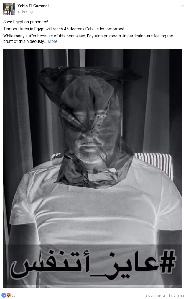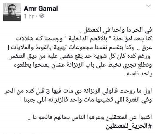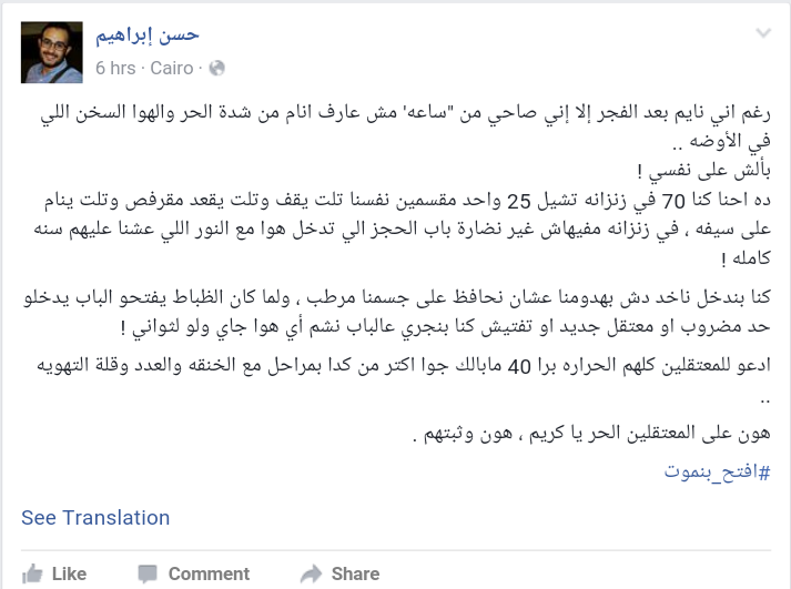 وقال الناشط عمرو جمال :”في الحر دا واحنا في المعتقل ..كنا بنقعد ” بالملابس الداخلية ” وجسمنا كله شلالات عرق .. وكنا بنقسم نفسنا مجموعات تهوية بالفوط والملايات”.