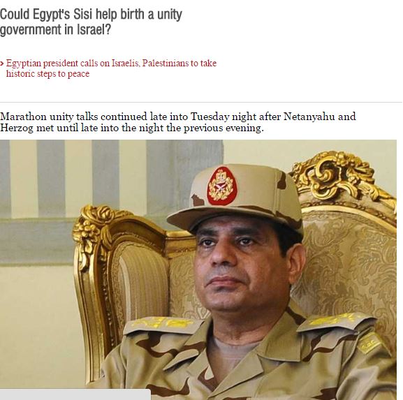 ترى صحيفة "جيروسالم بوست " "الإسرائيلية" أن الترحيب الذي لاقته تصريحات عبدالفتاح السيسي حول السلام الفلسطيني "الإسرائيلي" من قبل "نتنياهو" وزعيم حزب العمال "هرتسوج" ستساعد بشكل كبير في سرعة تكوين حكومة الوحدة الوطنية الجديدة.