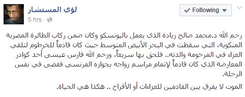 كشفت مصادر أن الراكب السوداني الذي كان ضمن ركاب الطائرة المصرية المنكوبة هو الدكتور محمد صالح زيادة والذي كان في طريقه للخرطوم لتقديم العزاء في والدته.