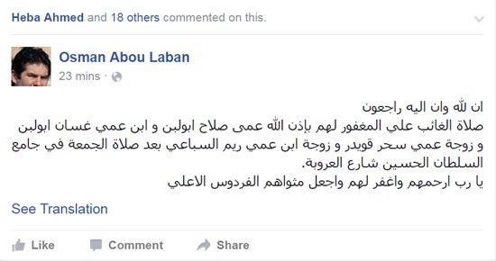 وكتب أبو لبن فى منشور له عبر صفحته الشخصية بموقع التواصل الاجتماعي “فيس بوك”: “إن لله وإن إليه راجعون.. صلاة الغائب على المغفور لهم بإذن الله عمى صلاح أبولبن و ابن عمى غسان أبولبن و زوجة عمى سحر قويدر وزوجة ابن عمى ريم السباعى، بعد صلاة الجمعة فى جامع السلطان الحسين شارع العروبة.. يا رب ارحمهم واغفر لهم واجعل مثواهم الفردوس الأعلى”.