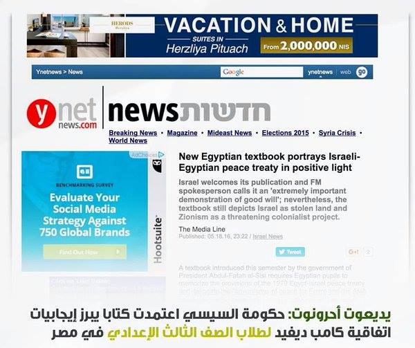 كشفت صحيفة يديعوت أحرونوت الإسرائيلية عن كتاب اعتمدته حكومة عبدالفتاح السيسي لطلاب الصف “الثالث الإعدادي”، يبرز إيجابيات اتفاقية كامب ديفيد للسلام مع الاحتلال الإسرائيلي، والتي تم توقيعها عام 1978، وأهدرت فيها مصر الكثير من حقوقها.