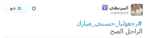 تصدر هاشتاج "رجعولنا_حسني_مبارك"، قائمة الأعلى تداولا بموقع التدوينات القصيرة "تويتر"، اليوم الأحد، بعد أن دشنه أحد مؤيدي الرئيس المخلوع مبارك، لمعرفة آراء نشطاء الموقع فيه.