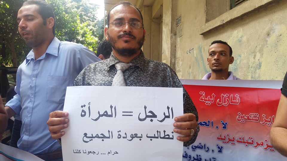 رفع المحتجون لافتات كتبوا عليها “الدستور قال المساواة”.. “لا للاغتراب”.. “الرجل بيساوي المرأة العودة للجميع”.