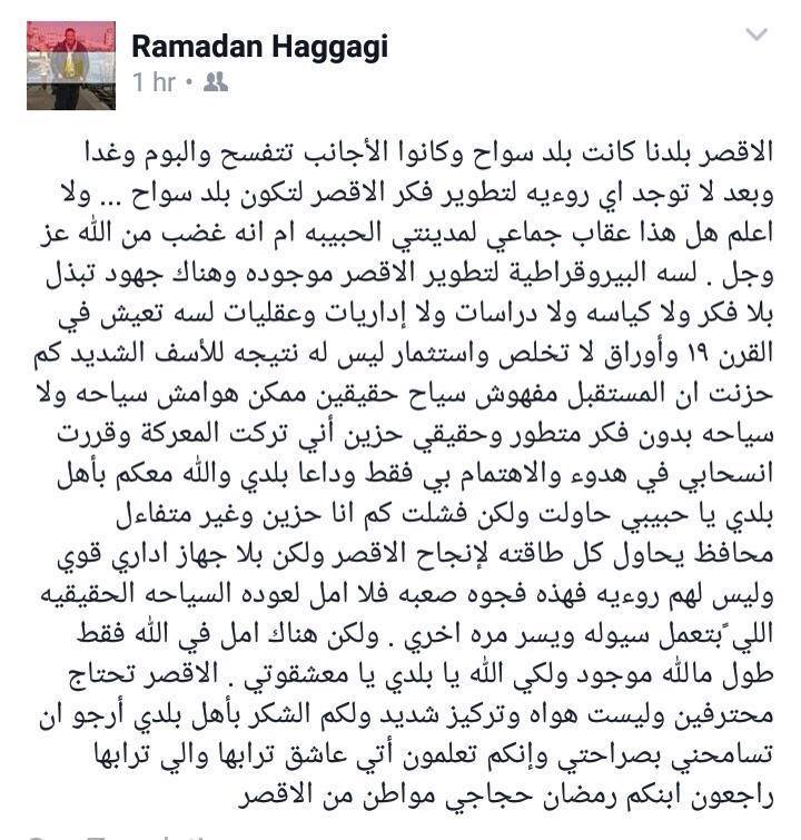 وقال حجاجي -على صفحته الشخصية على موقع التواصل الاجتماعي فيس بوك-: “لا توجد رؤية حقيقية لتكون الأقصر بلدًا يستقطب السائحين، ولا أعلم هل هذا عقاب جماعي للمدينة أم أنه غضب من الله!”.