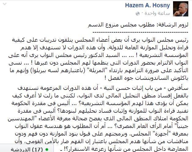 وأضاف “حسني” ساخرا: “السيد الدكتور رئيس مجلس النواب يرى أن على النواب الالتزام بحضور الدورات التي ينظمها لهم المجلس دون غيرها!.. نسي التأكيد على ضرورة التزامهم بارتداء “المريلة” (باعتبارهم لسه بيريلوا) وإنهم ما ياكلوش الساندويتشات جوه الفصل”!.
