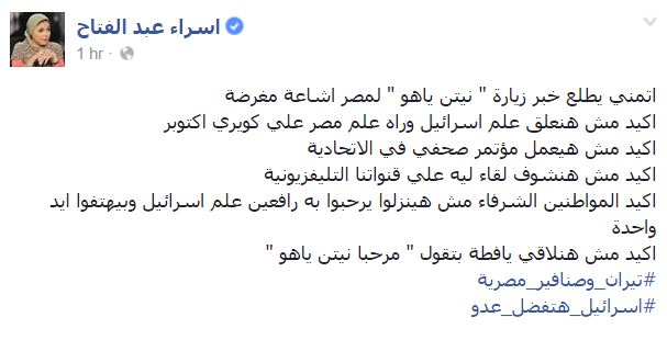 وتابعت “عبدالفتاح”: “أكيد مش هنشوف لقاء ليه على قنواتنا التليفزيونية، أكيد المواطنين الشرفاء مش هينزلوا يرحبوا به رافعين علم إسرائيل وبيهتفوا إيد واحدة، أكيد مش هنلاقي يافطة بتقول “مرحبًا نتنياهو”.. تيران وصنافير مصرية.. إسرائيل هتفضل عدو”.