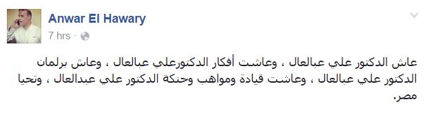وقال- عبر منشور له على “فيس بوك”- “عاش الدكتور علي عبدالعال، وعاشت أفكار الدكتورعلي عبدالعال، وعاش برلمان الدكتور علي عبدالعال، وعاشت قيادة ومواهب وحنكة الدكتور علي عبدالعال، وتحيا مصر.