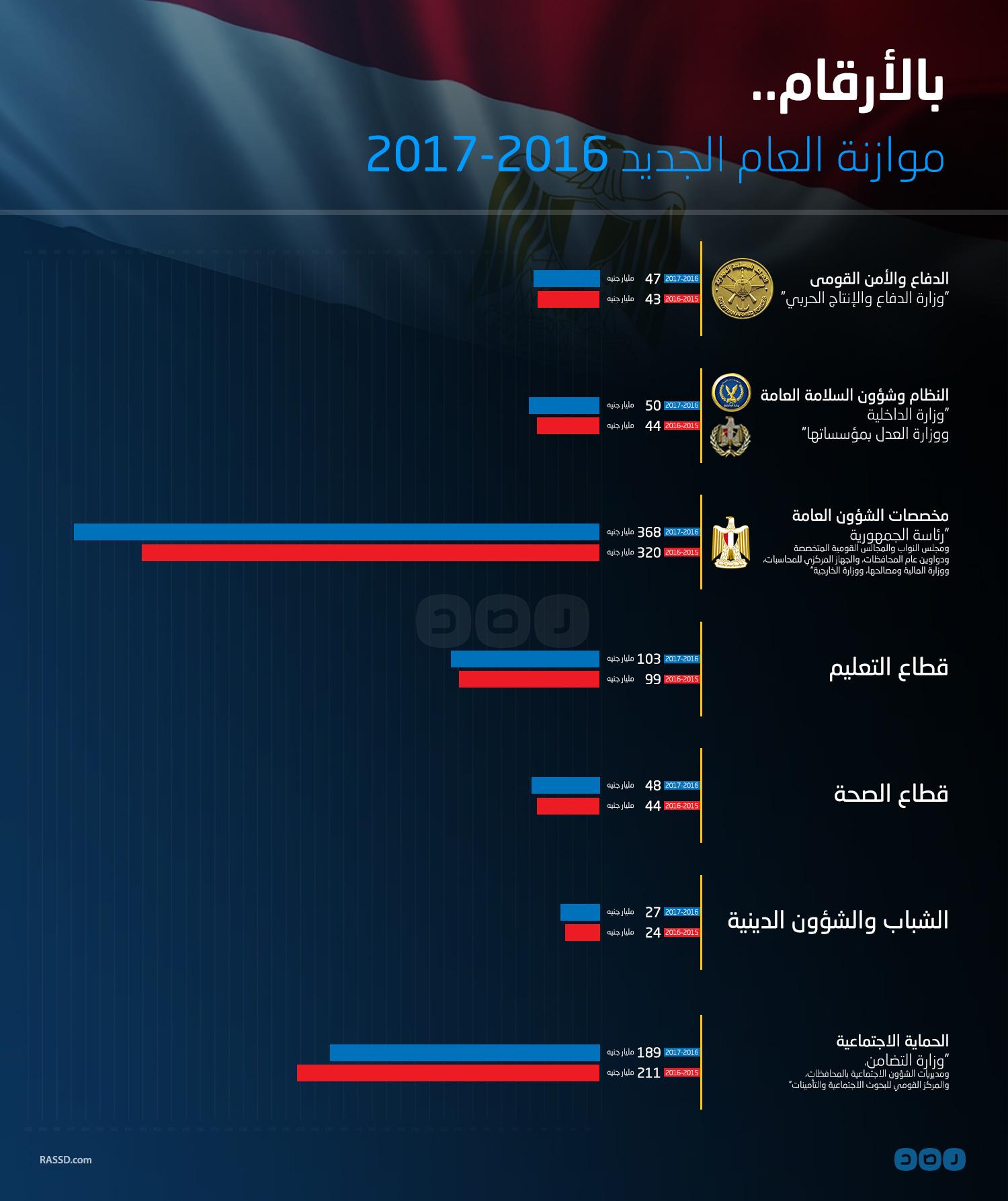 – موازنة قطاع “الدفاع والأمن القومي” في الموازنة الجديدة 2016/2017 نحو 47 مليار جنيه، مقارنة بنحو 43 مليار جنيه في الموازنة الحالية بمعدل نمو 9% بزيادة نحو 4 مليارات جنيه، على أن تخصص تلك النفقات للصرف على وزارتي الدفاع والإنتاج الحربي.