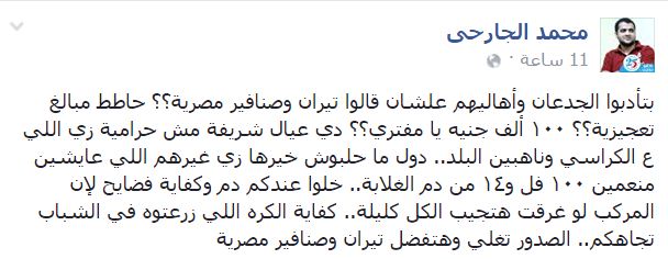 وقال -عبر منشور له على “فيس بوك”-: “بتأدبوا الجدعان وأهاليهم علشان قالوا تيران وصنافير مصرية؟؟ حاطط مبالغ تعجيزية؟؟ ١٠٠ ألف جنيه يا مفتري؟؟”. وأضاف “الجارحي”: “دي عيال شريفة مش حرامية زي اللي ع الكراسي وناهبين البلد.. دول ما حلبوش خيرها زي غيرهم اللي عايشين منعمين ١٠٠ فل و١٤ من دم الغلابة”.