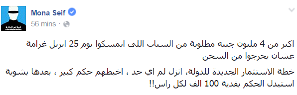 استنكرت الناشطة السياسية منى سيف، قرار تغريم متظاهري 25 أبريل “جمعة الأرض” 100 ألف جنيه. وقال- عبر منشور لها على “فيسبوك”- “أكتر من 4 مليون جنيه مطلوبة من الشباب اللي اتمسكوا يوم 25 أبريل غرامة عشان يخرجوا من السجن”.