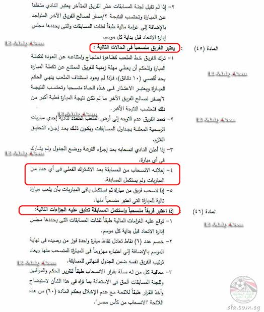 وتنص لائحة الاتحاد المصري لكرة القدم في حالة انحساب فريق من البطولة ورفضه استكمالها ففي حالة صدور ذلك القرار في الدور الأول يتم إلغاء نتائج مباريات الفريق به وكأنه لم يشارك من الاساس.