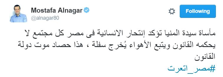 وقال -عبر تغريدة له على “تويتر”-: “مأساة سيدة المنيا تؤكد انتحار الإنسانية في مصر.. كل مجتمع لا يحكمه القانون ويتبع الأهواء يُخرج سفلة، هذا حصاد موت دولة القانون.. مصر اتعرت”.