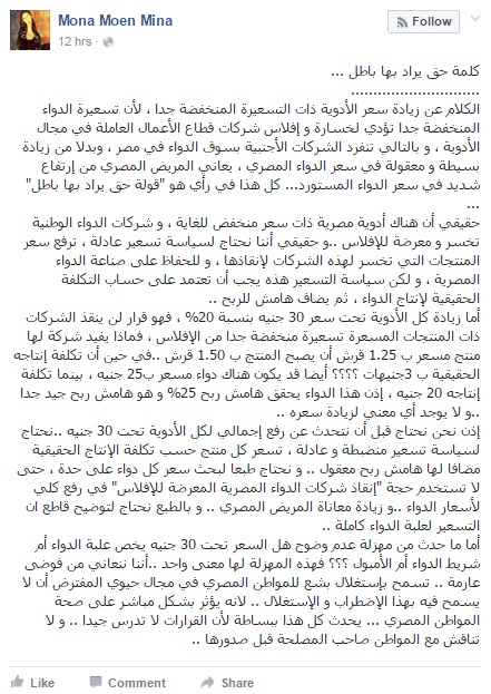 وكتبت منى مينا في منشور مطول لها عبر صفحتها الشخصية بموقع التواصل الاجتماعي “فيس بوك” بعنوان “كلمة حق يراد بها باطل”: “الكلام عن زيادة سعر الأدوية ذات التسعيرة المنخفضة جدا، لأن تسعيرة الدواء المنخفضة جدا تؤدي لخسارة وإفلاس شركات قطاع الأعمال العاملة في مجال الأدوية، وبالتالي تنفرد الشركات الأجنبية بسوق الدواء في مصر، وبدلا من زيادة بسيطة ومعقولة في سعر الدواء المصري، يعاني المريض المصري من ارتفاع شديد في سعر الدواء المستورد.. كل هذا في رأيي هو (قولة حق يراد بها باطل)”.