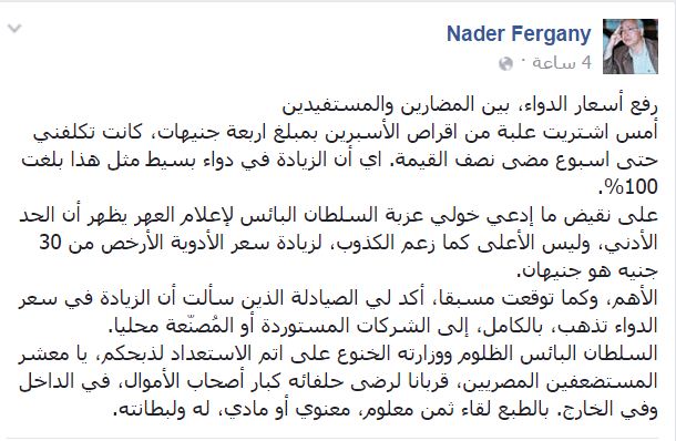 وقال -عبر منشور له على “فيس بوك”-: اشتريت علبة من أقراص الأسبرين بمبلغ أربعة جنيهات، بينما كانت تكلفتها منذ أسبوع مضى نصف القيمة، ما يعني أن الزيادة في دواء بسيط مثل هذا بلغت 100%.