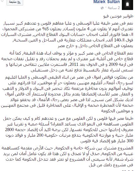 واختتم “سلطان”: “طبعًا مصر فيها فلوس ولكن الفلوس مع مين وعددهم كام وكيف يمكن جعل الفلوس مساهمة في النمو الذي يساعد الفقراء؟ أسئلة صعبة وتقريبًا غير معروف إجابتها حتى للحكومة نفسها، لكن برضه أكيد أن اقتصاد حجمه 2800 مليار جنيه وموازنته الحكومية بتدفع مرتبات حكومية 200 مليار وفوائد ديون 300 مليار هو اقتصاد فيه فلوس”.