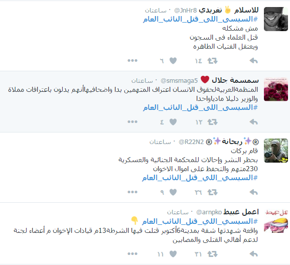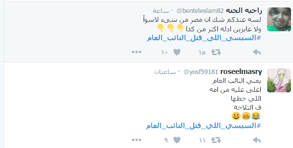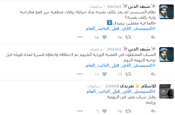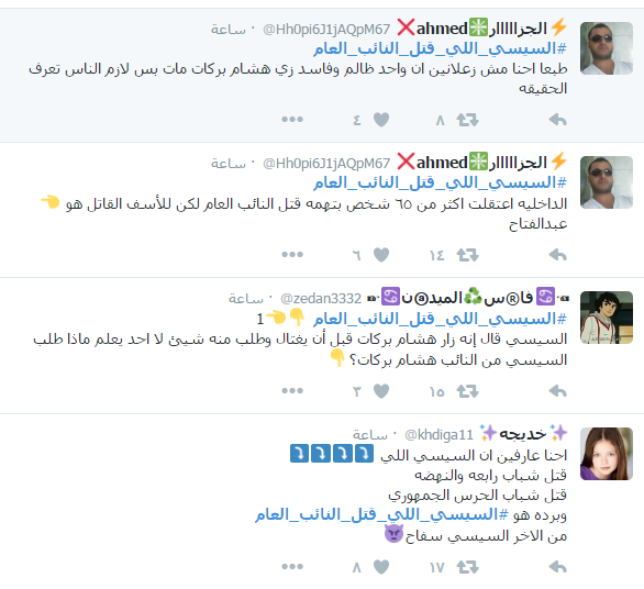 وأطلق الرواد هاشتاج تحت عنوان “السيسي اللي قتل النائب العام”، عبروا خلاله عن استياءهم من السياسة التي تبعها السيسي في التعامل مع الشباب، ومنهم من اتهم إياه بقتل الشباب في اعتصام رابعة والنهضة، أما آخرون فركزوا على الأوضاع السيئة التي تعيشها مصر.
