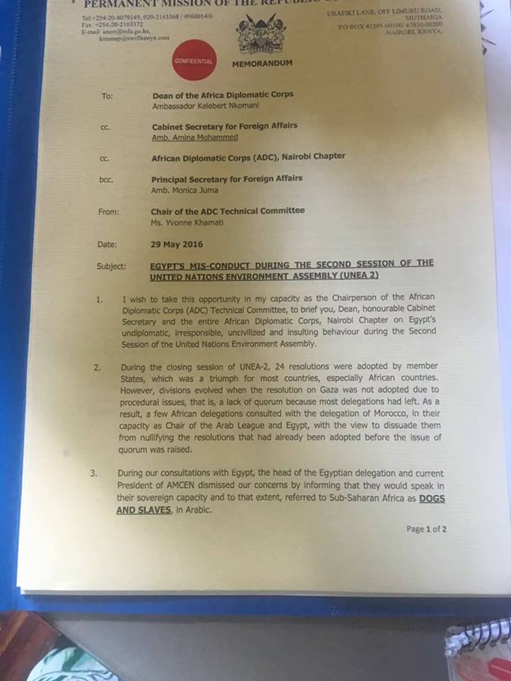 المندوبة الكينية سرعان ما رفعت مذكرة تقدمت بها إلى رئيس البعثات الدبلوماسية الأفريقية، احتجت فيها على نعت رئيس الوفد المصري دول صحراء أفريقيا بـ “الكلاب والعبيد”، متحدثا باللغة العربية، وذلك خلال ترأسه لوفد بلاده في المؤتمر.