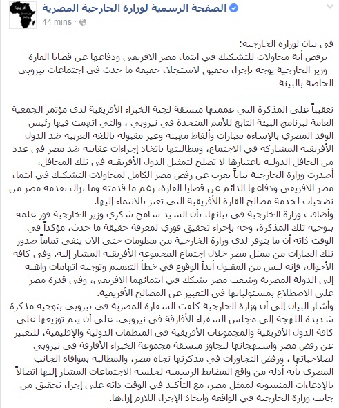 وعلقت وزارة الخارجية المصرية، اليوم، بقولها إنها ستحقق في المذكرة التي عمّمتها منسقة لجنة الخبراء الإفريقية لدى مؤتمر الجمعية العامة لبرنامج البيئة التابع للأمم المتحدة في العاصمة الكينية نيروبي.