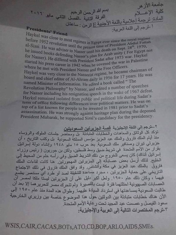 تدوال رواد مواقع التواصل الاجتماعي، صورة ضوئية لامتحان مادة “ترجمة إعلامية باللغة الإنجليزية” للفرقة الثانية بكلية الإعلام جامعة الأزهر، يتضمن سؤالاً للترجمة من اللغة العربية إلى الإنجليزية تحت عنوان “قصة الجزيرتين السعوديتين”، حيث جاء فيه أن كل الوثائق والمعاهدات تؤكد سعودية جزيرتي “تيران وصنافير”.