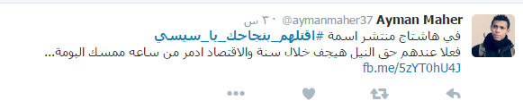 وقال أيمن ماهر:”في هاشتاج منتشر اسمه اقتلهم بنجاحك يا سيسي عندهم حق، النيل هيجف خلال سنة والاقتصاد ادمر من ساعة ممسك البومة”