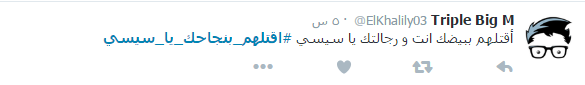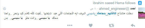 وسخر آخر قائلا”:دخلت هاشتاج السيسي أشوف أيه النجاحات، اللي لقيت كلام كله كيد ونحر وإحنا معاك يا سيسي وانت حلو يا سيسي”.