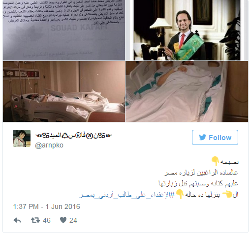 وتم تدشين هاشتاج “الاعتداء على طالب أردني بمصر”، وعبر الأردنيون من خلاله عن غضبهم من الحادث وطالبوا حكومة بلادهم بالعمل على إعادة الطالب إلى الأردن لاستكمال العلاج، ومتابعة القضية لمحاسبة الفاعلين.