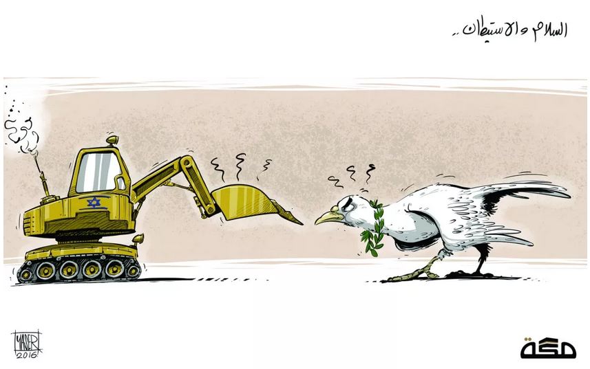 “الاستيطان يحارب السلام”.. كاريكاتير صحيفة “مكة السعودية”، في إشارة لتجاهل “إسرائيل” الدائم لعمليات السلام واستمرار إنشاء المستوطنات اليهودية.