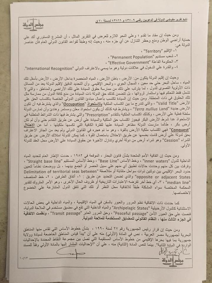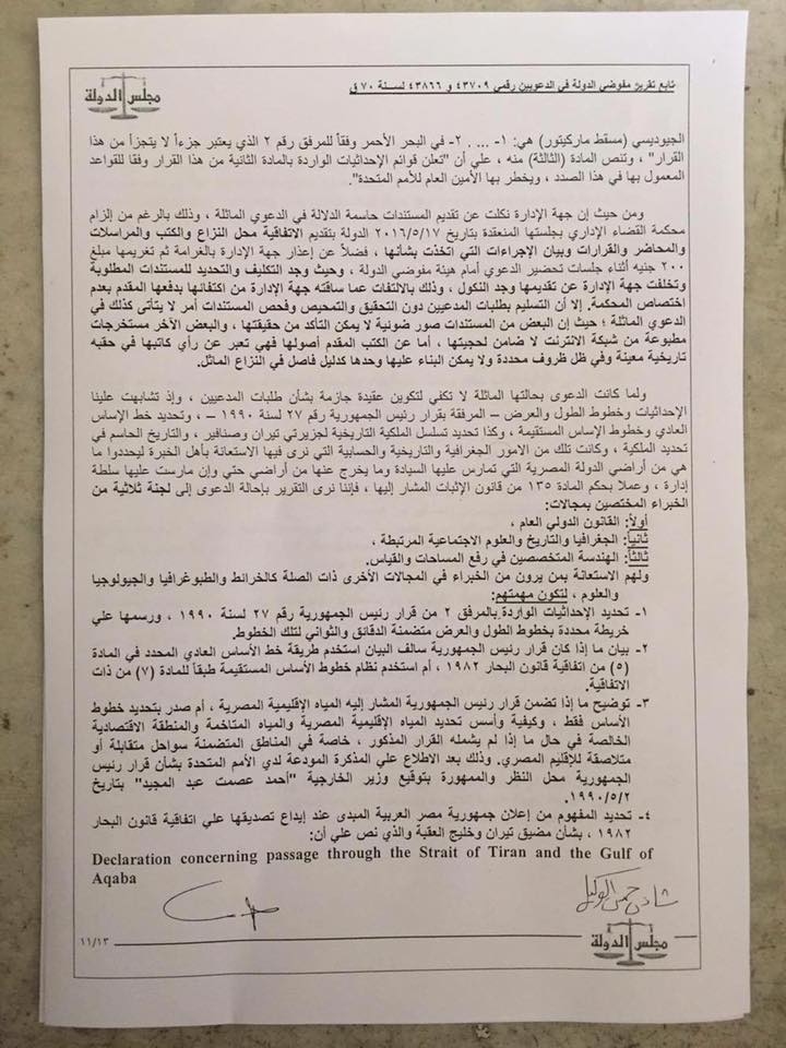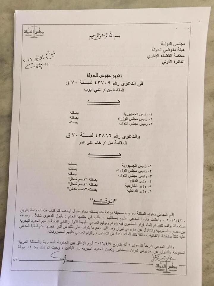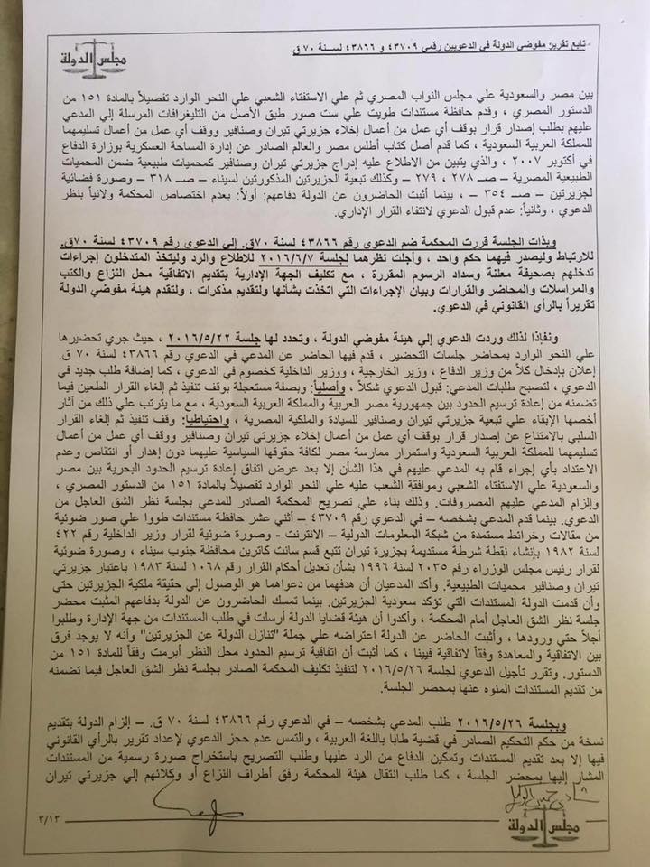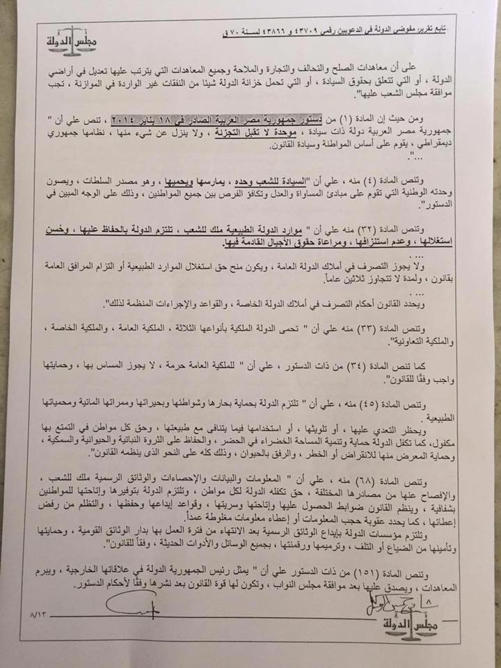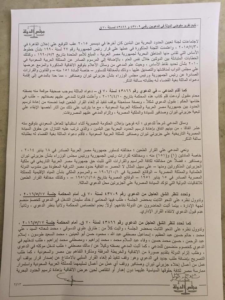 ومن جانبه نشر خالد علي، صورًا لنص تقرير هيئة مفوضي الدولة حول رأيها في قضية اتفاقية إعادة ترسيم الحدود البحرية مع السعودية، والتي تمَّ الإعلان بموجبها عن تبعية جزيرتي تيران وصنافير للسعودية.