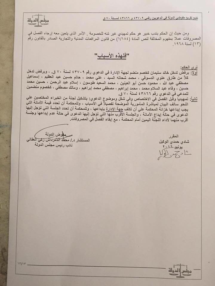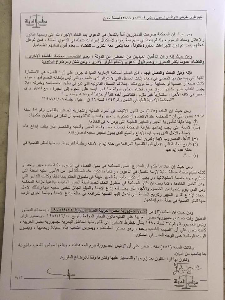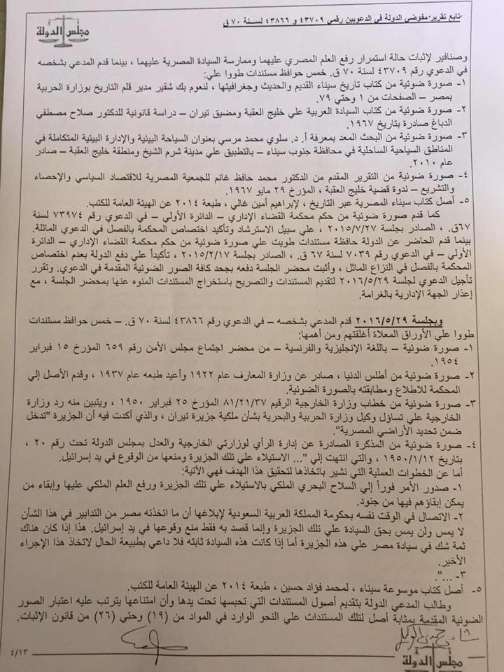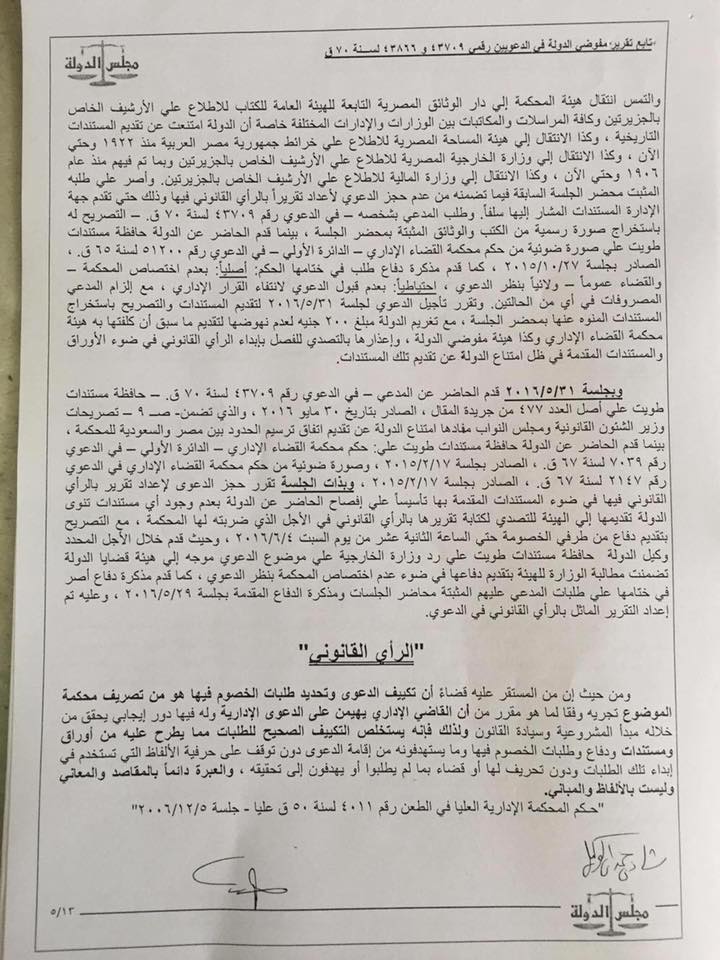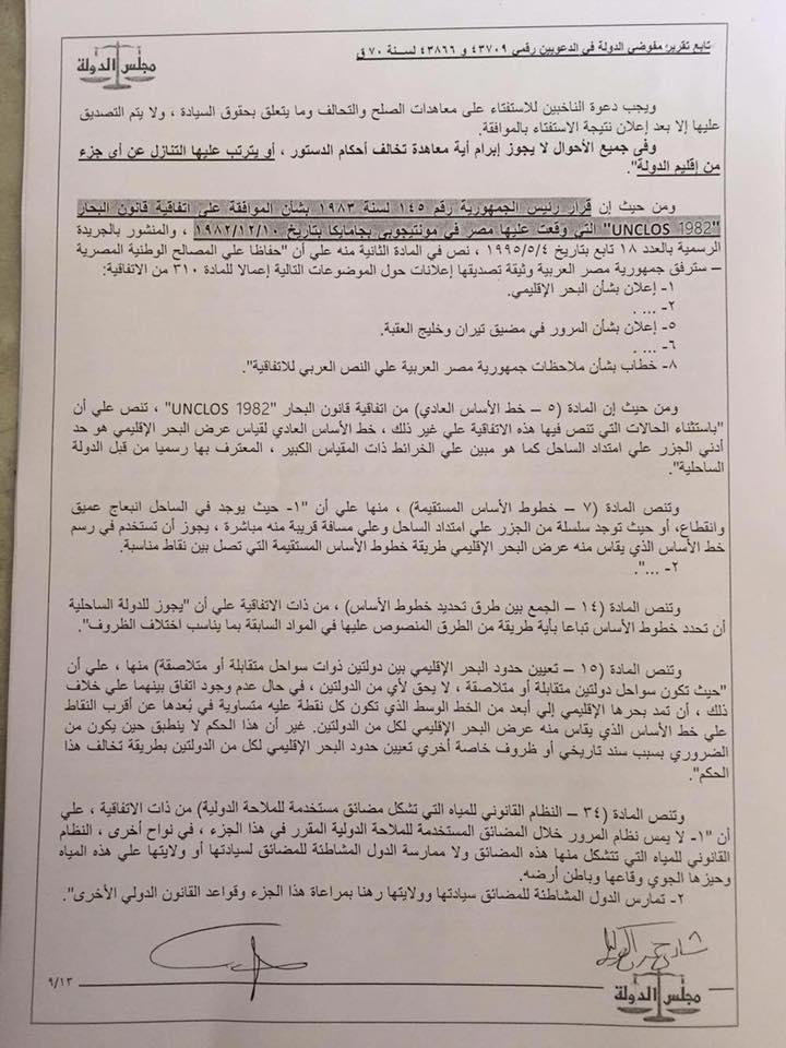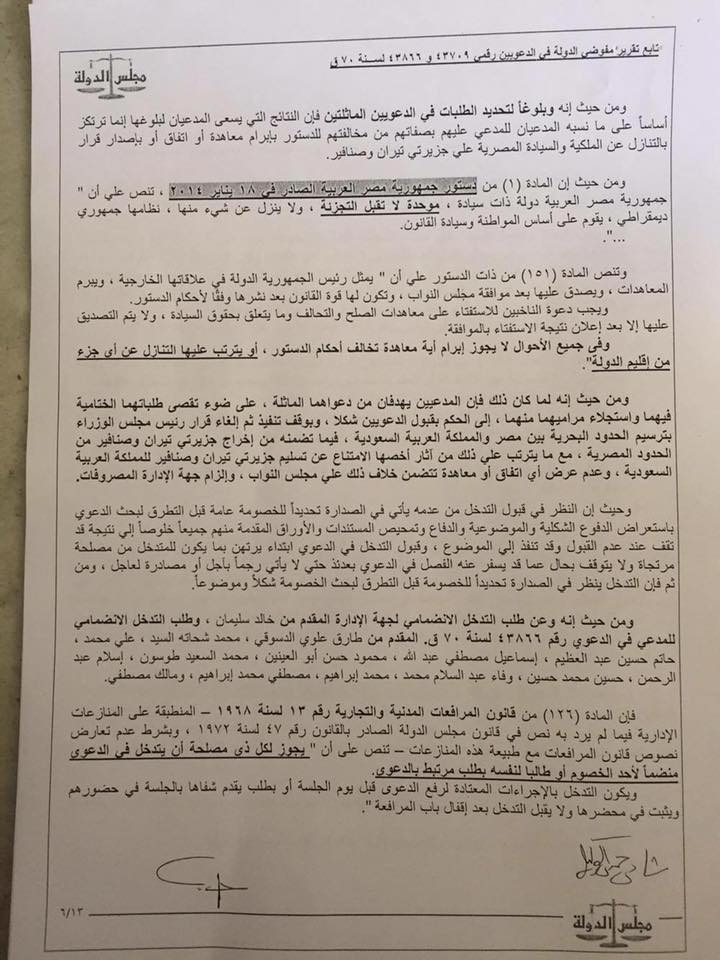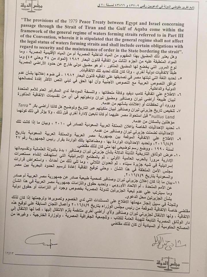 ومن جانبه نشر خالد علي، صورًا لنص تقرير هيئة مفوضي الدولة حول رأيها في قضية اتفاقية إعادة ترسيم الحدود البحرية مع السعودية، والتي تمَّ الإعلان بموجبها عن تبعية جزيرتي تيران وصنافير للسعودية.