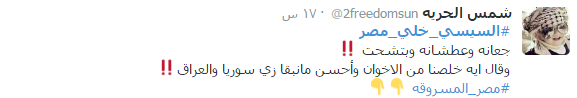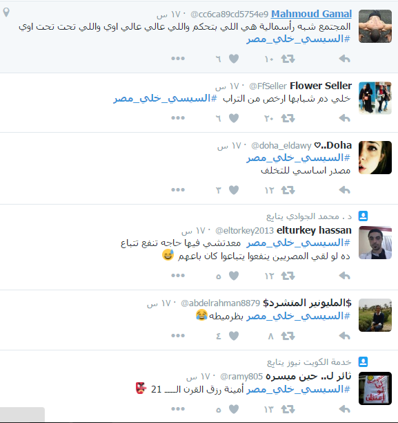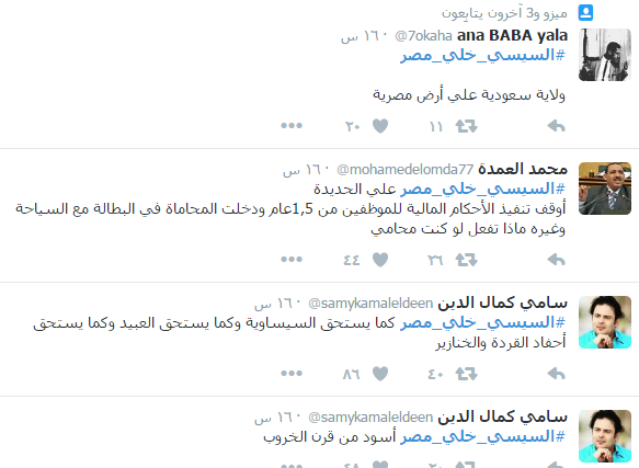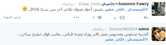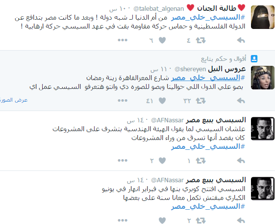 وأعرب مرتادو موقع التواصل الإجتماعي “تويتر” عن بالغ حزنهم من تردي الأوضاع الافتصادية وغلاء الاسعار، في حين امتعض البعض من تنازل السيسي عن جزيرتي تيران وصنافير للسعودية، وأشار آخرون إلى انتشار الفساد في عهد السيسي بدرجة غير مسبوقه، مؤكدين أن مصر أصبحت شبة دولة.