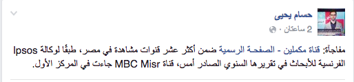وأضاف أن اليوم السابع نشرت أن “إبسوس” تلعب في نتائج مشاهدة القنوات، وأنها جعلت قناة mbc مصر أعلى مشاهدة، وأضافت اليوم السابع – حسب زعمها – أنه من ضمن تلاعب “إبسوس” وضع قناة مكملين ضمن القنوات الأعلى مشاهدة.