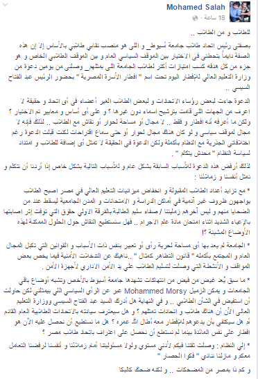 قال “صلاح” -عبر “فيس بوك”-: “لا مجال أو مساحة لحوار أو نقاش مع الطلاب.. لذلك فإنه لا مجال لموقف سياسي ولو كان هناك مجال لحوار أو حتى سماع اقتراحات لكنت قبلت الدعوة رغم اختلافاتي الجذرية مع النظام بأكمله، ولكن الدعوة في الحقيقة لا تمثل أي إضافة للطلاب وامتداد لسياسة النظام “محدش يتكلم”.. الطلاب في مصر يواجهون ظروفًا غير آدمية في أماكن الدراسة والمدن الجامعية، بالإضافة إلى انخفاض ميزانيات التعليم العالي.