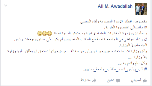 وعلق نائب رئيس اتحاد طلاب بجامعة دمنهور، علي عوض الله، على عدم توجيهه دعوة له بخصوص الإفطار: “اختصروا الطريق، وعملوا زي زيارة المخابرات العامة الأخيرة ومبعتوش الدعوة أصلًا، لأن غالبًا مواقفي في الجامعة خاصة مع الطلاب المفصولين لم يكن على مستوى توقعات رئيس الجامعة ولا الوزارة”.
