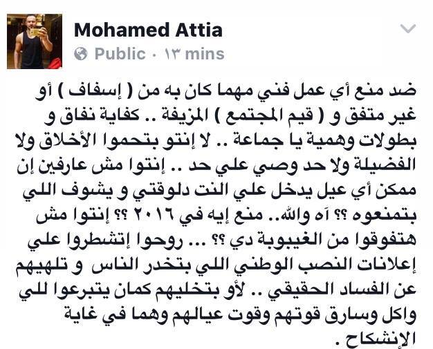 وأضاف: “كفاية نفاق و بطولات وهمية يا جماعة، لا أنتو بتحموا الأخلاق ولا الفضيلة ولا حد وصي على حد، أنتوا مش عارفين إن ممكن أي عيل يدخل علي النت دلوقتي و يشوف اللي بتمنعوه ؟؟ آه والله، منع إيه في ٢٠١٦ ؟؟ إنتوا مش هتفوقوا من الغيبوبة دي ؟؟“.