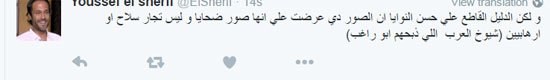 وتابع :”لكن الدليل القاطع على حسن النوايا إن الصور دى عرضت على إنها صور ضحايا وليس تجار سلاح أو إرهابيين (شيوخ العرب اللى ذبحهم أبو راغب)..بوجه عام ليس من حق أى أحد نشر صور لأى أحد دون الرجوع له أو لعائلته”.