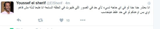 قدم الفنان يوسف الشريف، اعتذارًا لجمهوره عبر حسابه الخاص على موقع التواصل الاجتماعي " تويتر " عن بعض اللقطات التى ظهرت أمس بالحلقة السابعة لمسلسله "القيصر"، والتي قوبلت بموجة غضب عارمة من الجمهور ورواد مواقع التواصل الاجتماعي
