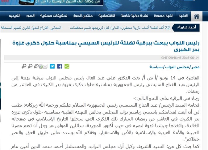 “فخامة السيد الرئيس/ عبد الفتاح السيسي رئيس الجمهورية السلام عليكم ورحمة الله وبركاته، يطيب لي أن أبعث لفخامتكم باسمي وباسم نواب المجلس بخالص التهنئة القلبية بمناسبة حلول ذكرى غزوة بدر الكبرى، في العاشر من رمضان المبارك، تلك الذكرى التي سجلها التاريخ الإسلامي في صفحاته الخالدة, واتخذها جيشنا قدوة لنصره في حرب أكتوبر المجيدة، سائلين المولى عز وجل أن تنعم مصرنا الحبيبة والأمة العربية والإسلامية بالأمن والاستقرار، وفقكم الله وسدد على طريق الحق والنصر خطاكم“.