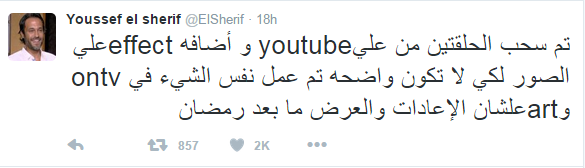 وكتب يوسف الشريف، عبر حسابه علي “تويتر”: “تم سحب الحلقتين من علي “youtube” و إضافة “effect” علي الصور لكي لا تكون واضحة؛ تم عمل نفس الشيء في ontv وart، علشان الإعادات والعرض ما بعد رمضان، وسيعلن اعتذار رسمي في المسلسل نفسه من كل طاقم العمل”.