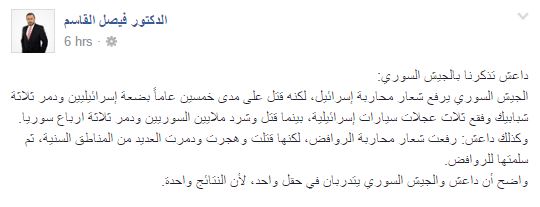 وقال القاسم في منشور له عبر حسابه على موقع “فيس بوك”: “داعش تذكرنا بالجيش السوري: الجيش السوري يرفع شعار محاربة إسرائيل، لكنه قتل على مدى خمسين عامًا بضعة إسرائيليين ودمر ثلاثة شبابيك وفقع ثلاث عجلات سيارات إسرائيلية، بينما قتل وشرد ملايين السوريين ودمر ثلاثة أرباع سوريا”.