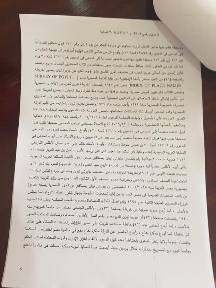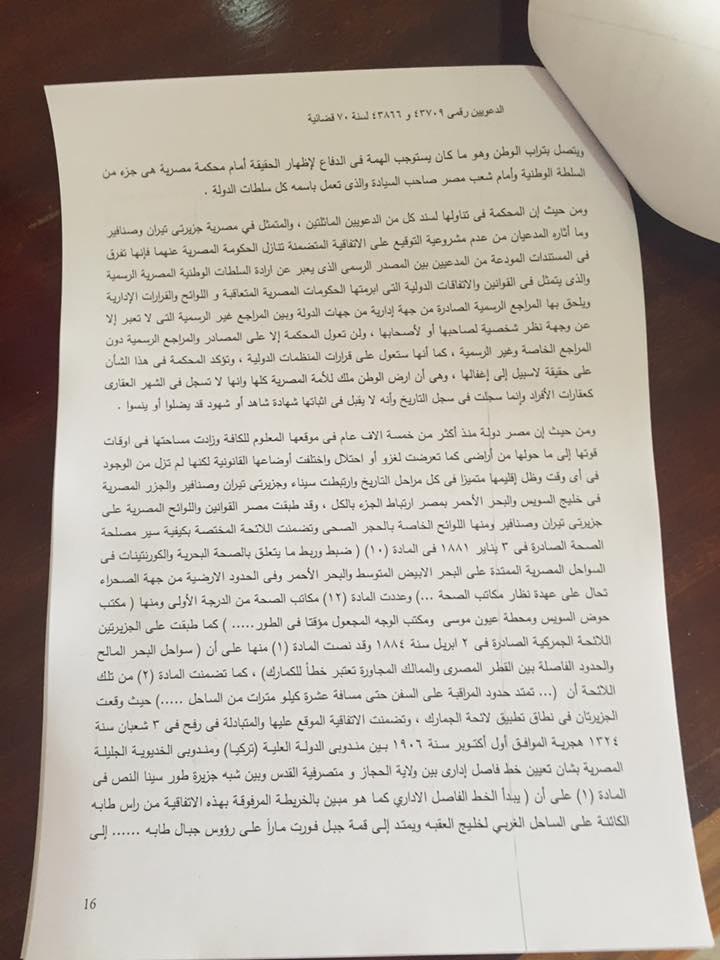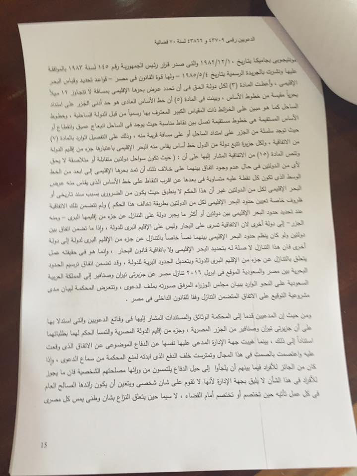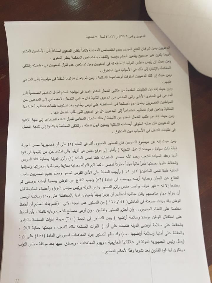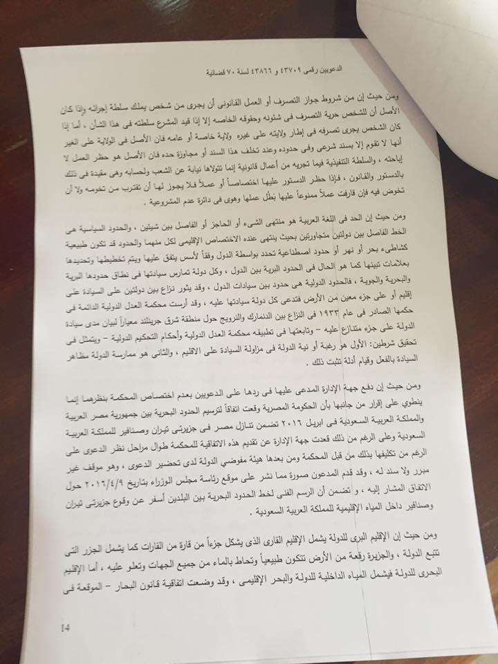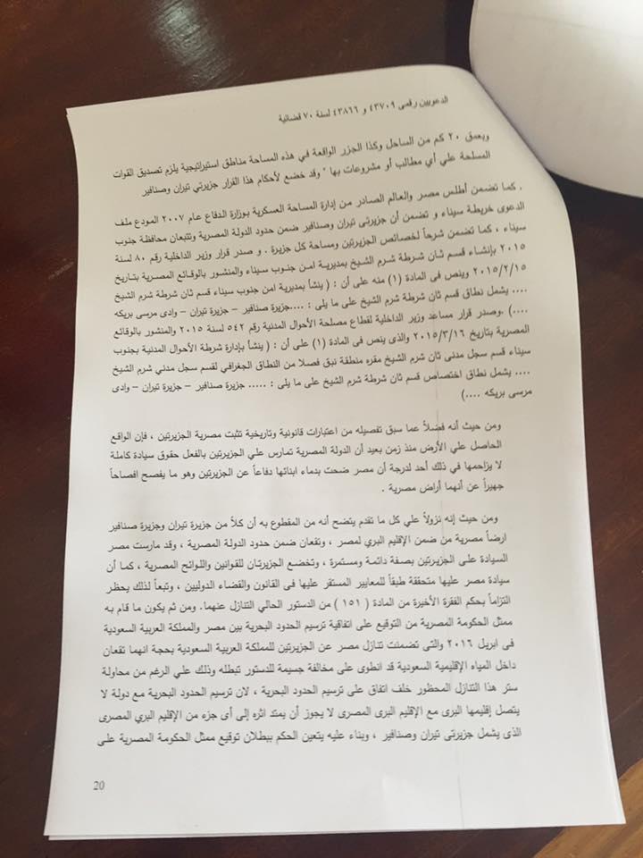 وأوضحت أن جميع القرارات والاعتبارات القانونية والتاريخية التي تأكدت منها المحكمة بواسطة مراجع رسمية قدمها الطاعنون تثبت مصرية الجزيرتين، وأن الواقع الحاصل على الأرض منذ زمن بعيد أن الدولة المصرية تمارس على الجزرتين بالفعل حقوق سيادة كاملة، لا يزاحمها في ذلك أحد، لدرجة أن مصر ضحت بدماء أبنائها دفاعًا عن الجزيرتين، وهو ما يفصح إفصاحًا جهيرًا عن أنها أرض مصرية.
